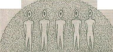 He realized there was something strange about them, and he described them this way: “When I take a better look I see they were all white but as if they were inside a screen, like a projection…” They came closer and closer until they were about 20 meters away. They then came together, moved “something like hands,” and “the screen becomes smaller in the shape of a cone that lifts up…” He said, “I saw no feet since they moved in a sliding motion.” He explained that he couldn’t give a better description “because I was so scared, it’s difficult for me to retain the image.”