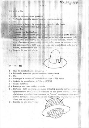 There is a case in Bulletin 1 involving humanoids and physical contact reported to have taken place in São Paulo on August 28, 1968. According to the report (page 14 of the pdf), the witness saw a person wearing “yellow pants and a T-shirt” standing 100 meters from a power plant and asked him to move away. The person told him, “I am waiting for companions who are hunting.” Two days later, he saw the same person in the same spot, and he was wearing “a yellow blouse and clear pants.” He saw another person in dark clothing looking at him through a window in the “Central” (power plant?). The witness happened to have been carrying a piece of conduit and swung twice at the first person and missed. The person in the Central came out by “passing through the window” and helped the other “dominate the witness.” The witness was lifted up and dropped several times, and then the first person slapped him on the back and said, “go away, you tramp, that [sic] we will return when this work is over.” As the witness ran away, he saw a light blue, metallic, hat-shaped object with a door. There was a yellow light coming through the door and he could see three “crew members,” which included the two he encountered, as they closed it. He then heard a “frying noise initiating the movement of the UFO.”