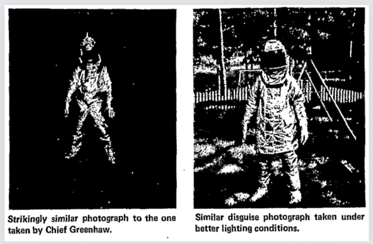 Webb managed to acquire such a suit, added aluminum foil to the hood and feet, and had his picture taken wearing it. While there were similarities to Greenhaw’s photos, Webb found it difficult to move in the uniform, which contradicts Greenhaw’s claim that the creature outran his car. Webb speculated that Greenhaw had only gone a short distance before spinning out in the gravel, which is a detail that shows up in Bell’s blog.